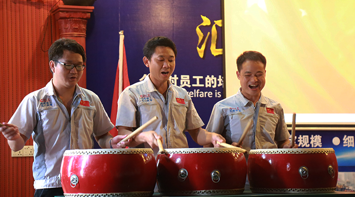 隨后,東莞分公司廠長歐陽輝鳳、智能裝備研發中心工程師鐘揚、裝配測試技術員劉洋「三陽開泰」共同敲響士氣鼓、鼓舞匯興智造奮勇前進。