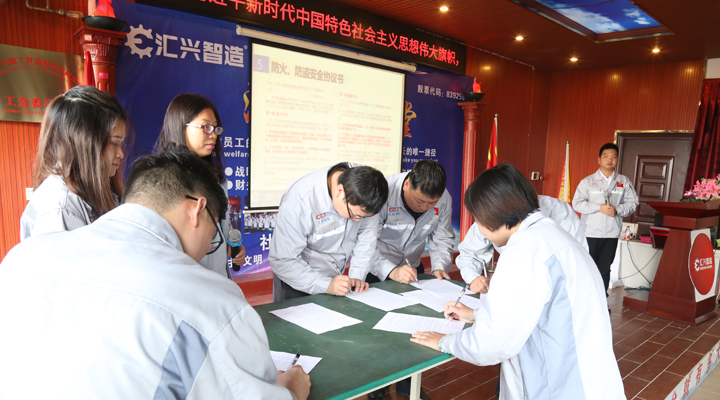 璞玉有瑕,有先進,就有落后,有表揚,就有懲戒。沒有規矩,不成方圓,所以大會的第四個議程對公司管理制度做了進一步宣講和引導。人事經理袁侃結合實際案列,諄諄告誡全體員工遵守法律、行政法規、公司制度,不要以身試法、以身犯險。并發起第五個會議議程,倡議匯興智造全體員工簽訂《防火、防盜安全協議書》,各部門負責人率先上臺在協議書上簽字,用實際行動表決心。