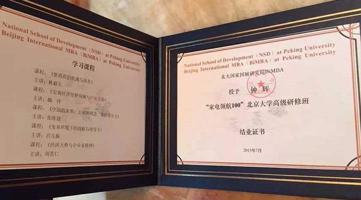 同時,經過一年的學習和相處,“家電領航100”北大班的同學們迎來了結業的日子。匯利興集團董事長鐘輝為此次畢業學員,中國慧聰家電城董事總經理宋冰晨先生為“家電領航100”北大班的同學們頒發結業證書。