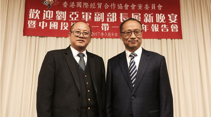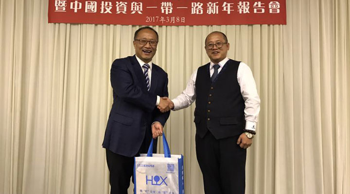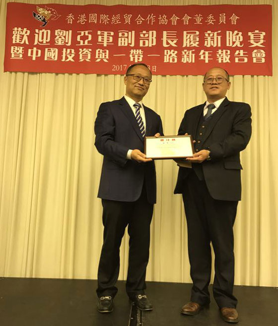 201738日,匯興智造董事長鐘輝受邀參加由香港國際經貿合作協會會董委員會在港島陽明山莊舉辦的“歡迎劉亞軍副部長履新晚宴暨中國投資與一帶一路新年報告會”。
