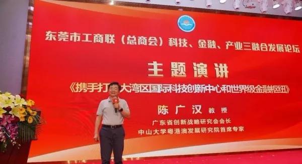 大會還邀請廣東省創(chuàng)新戰(zhàn)略研究會會長、中山大學粵港澳發(fā)展研究院首席專家陳廣漢教授作了《攜手打造大灣區(qū)國際科技創(chuàng)新中心和世界級金融樞紐》主題演講。陳廣漢教授就東莞在參與粵港澳大灣區(qū)建設的過程中,在推動科技、金融、產(chǎn)業(yè)“三融合”方面的機遇與主要努力方向進行全方位解讀。