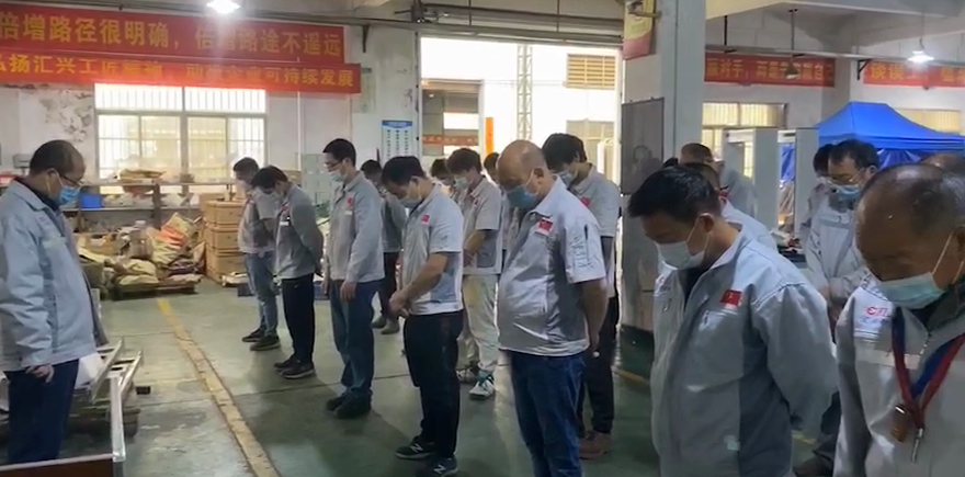 上午十點(diǎn),董事長鐘輝親率生產(chǎn)車間仍在加班趕工口罩機(jī)的在廠員工,進(jìn)行3分鐘哀悼,大家神情凝重肅立,靜立默哀。匯興全體員工以此表達(dá)對抗擊新冠肺炎疫情斗爭犧牲烈士和逝世同胞的深切哀悼。逝者安息,生者堅(jiān)強(qiáng)。