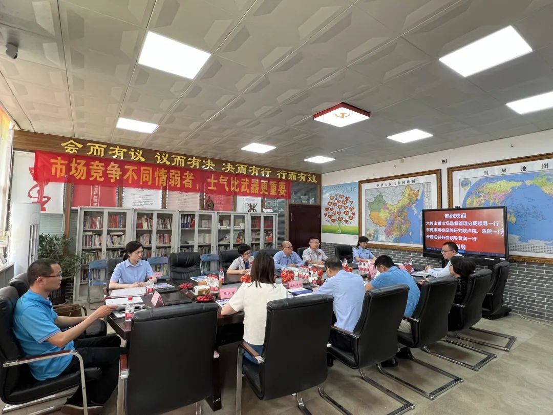 5月15日,大嶺山市場監(jiān)管局調(diào)研員高級主辦劉明周、監(jiān)管二股股長歐陽送明一行,東莞市商標(biāo)品牌研究院榮譽(yù)院長盧靜娜、副院長陳成蝶、智庫專家周沛