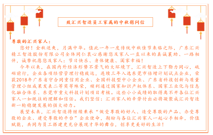 尊敬的匯興家人: 您好!金秋送爽,月滿中華。值此一年一度傳統中秋佳節來臨之際,廣東匯興精工智造股份有限公司......