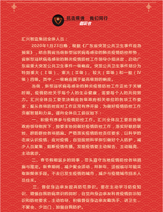 匯興智造集團全體人員: 2020年1月23日晚,根據《廣東省突發公共衛生事件應急預案》,結合我省當前新型......